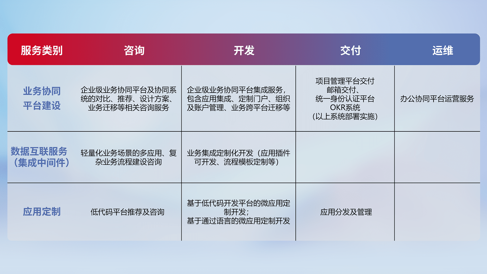 针对钉钉、、、、企微、、、IDaas等平台级产品提供产品的规划、、、方案、、交付、、、、定制化开发等服务,,,实现如统一协同办公、、、智能客户服务、、混合会议管理、、智能数据查询、、、等业务场景,,,实现数字化转型。。。。